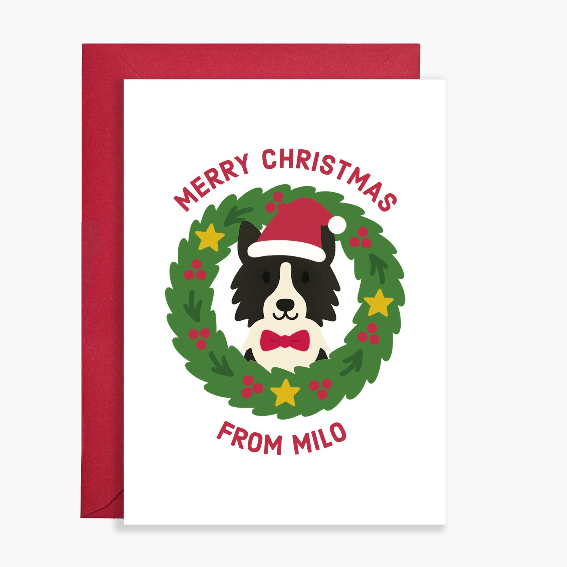 This adorable Merry Christmas from [Dog Name] card features a cute, minimalist border collie illustration framed in a festive wreath, complete with Santa hat and bow tie. A fun and personal way to send Christmas cheer from your dog!