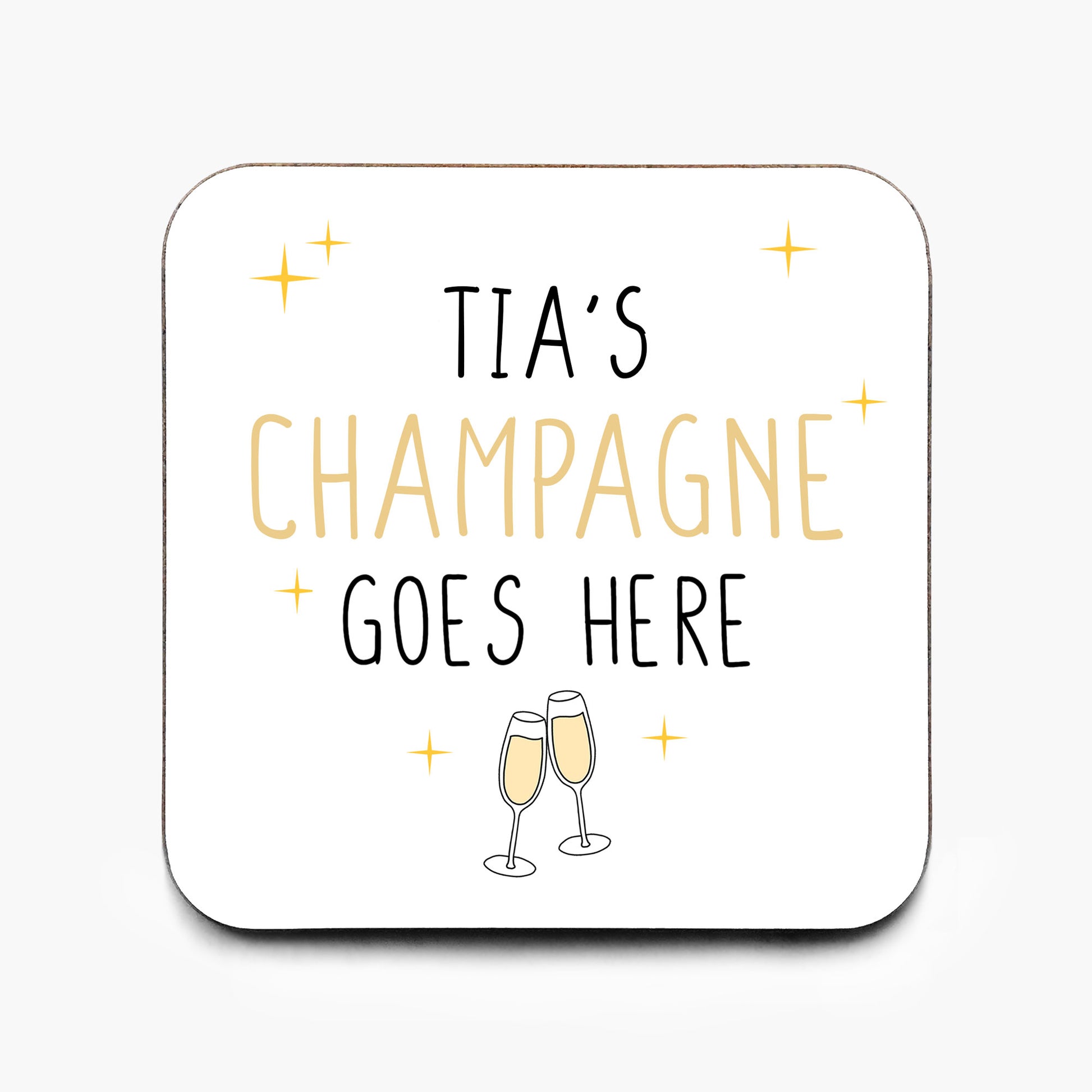 The printed text on the coaster reads: [name]'s champagne goes here.