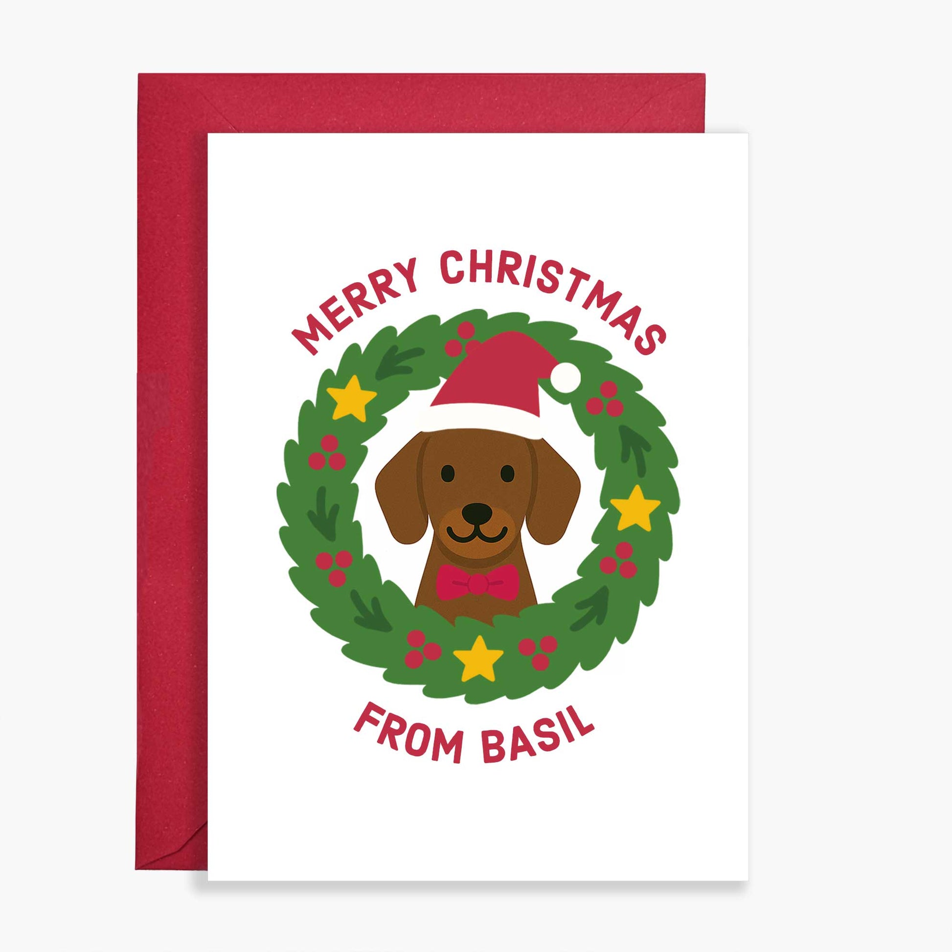 This adorable Merry Christmas from [Dog Name] card features a cute, minimalist dachshund illustration framed in a festive wreath, complete with Santa hat and bow tie. You can even choose the fur colour to match your own pup, making it a truly personal way to send Christmas cheer from your dog!