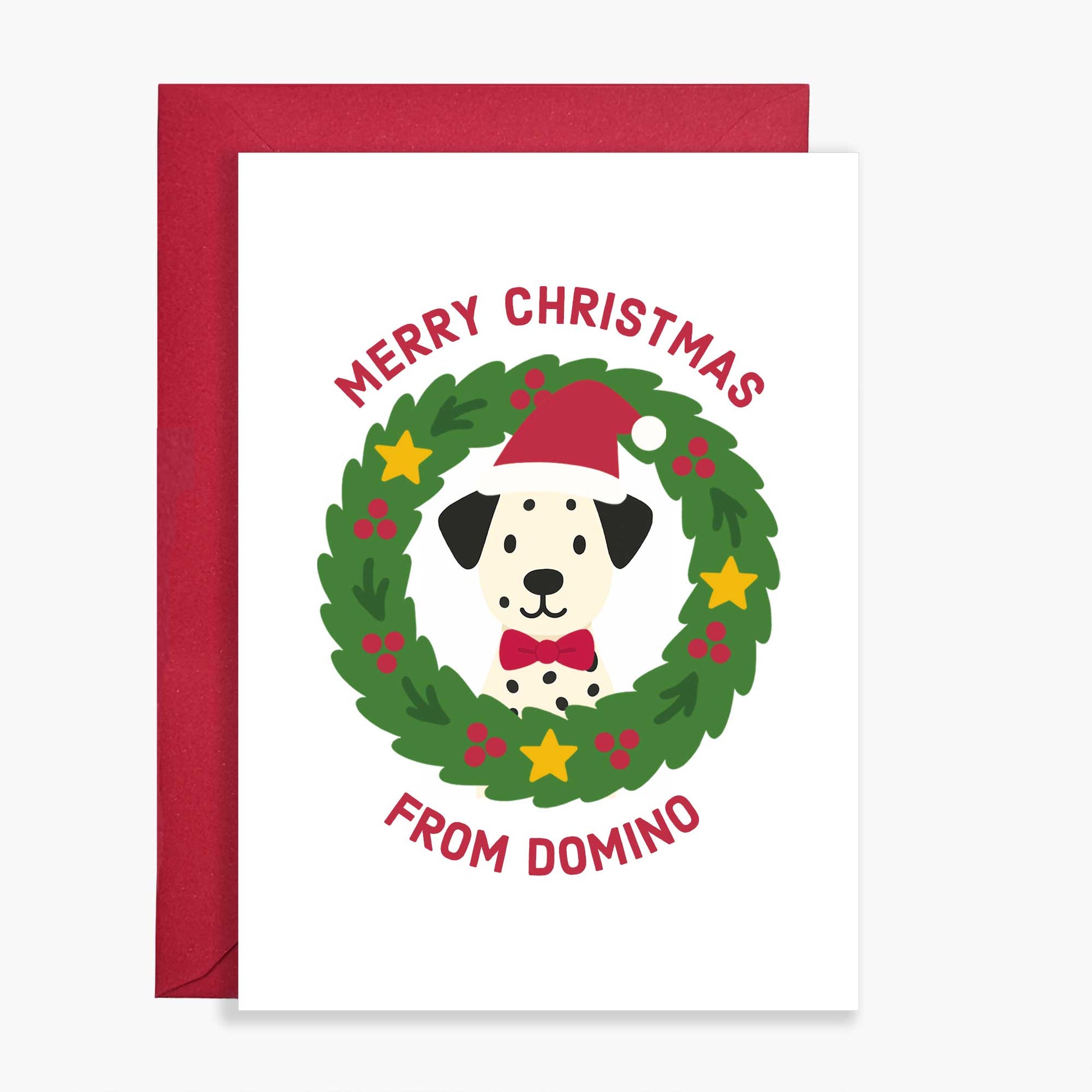 This adorable Merry Christmas from [Dog Name] card features a cute, minimalist dalmatian illustration framed in a festive wreath, complete with Santa hat and bow tie. A fun and personal way to send Christmas cheer from your dog!