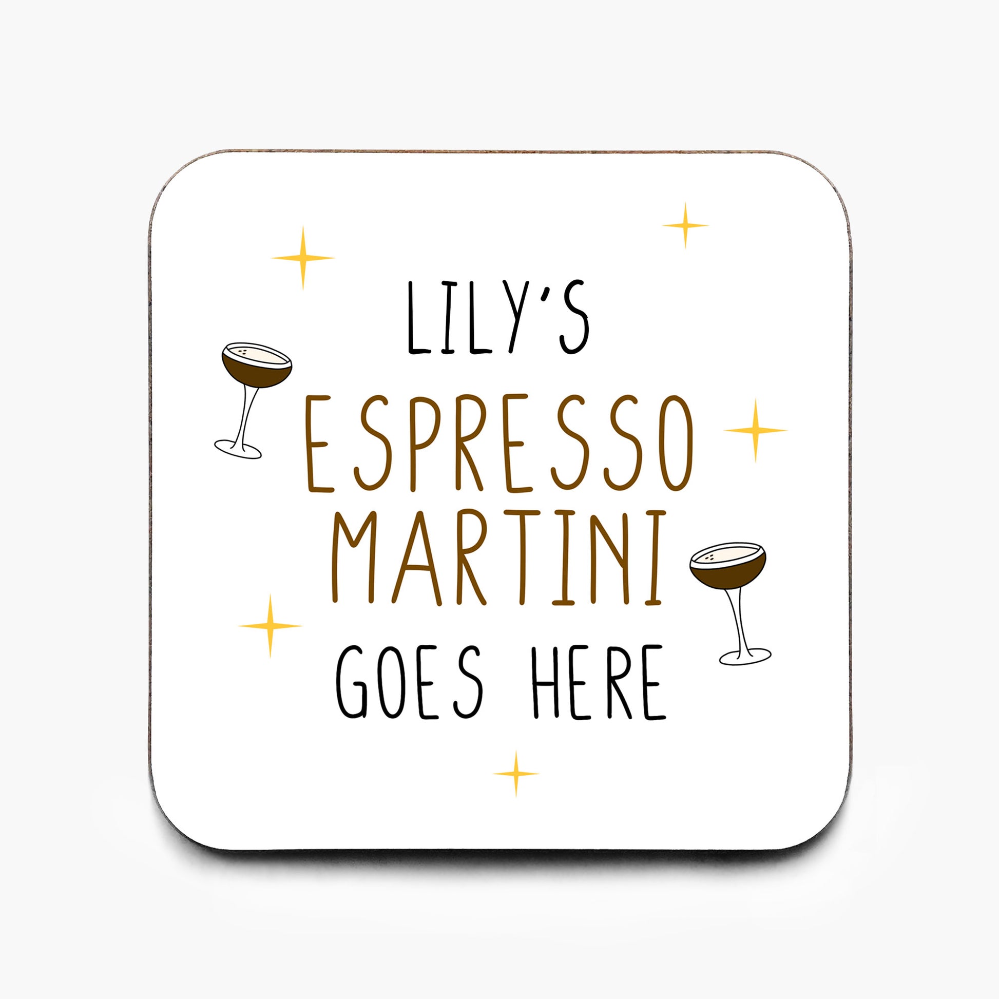 The printed text on the coaster reads: [name]'s espresso martini goes here.
