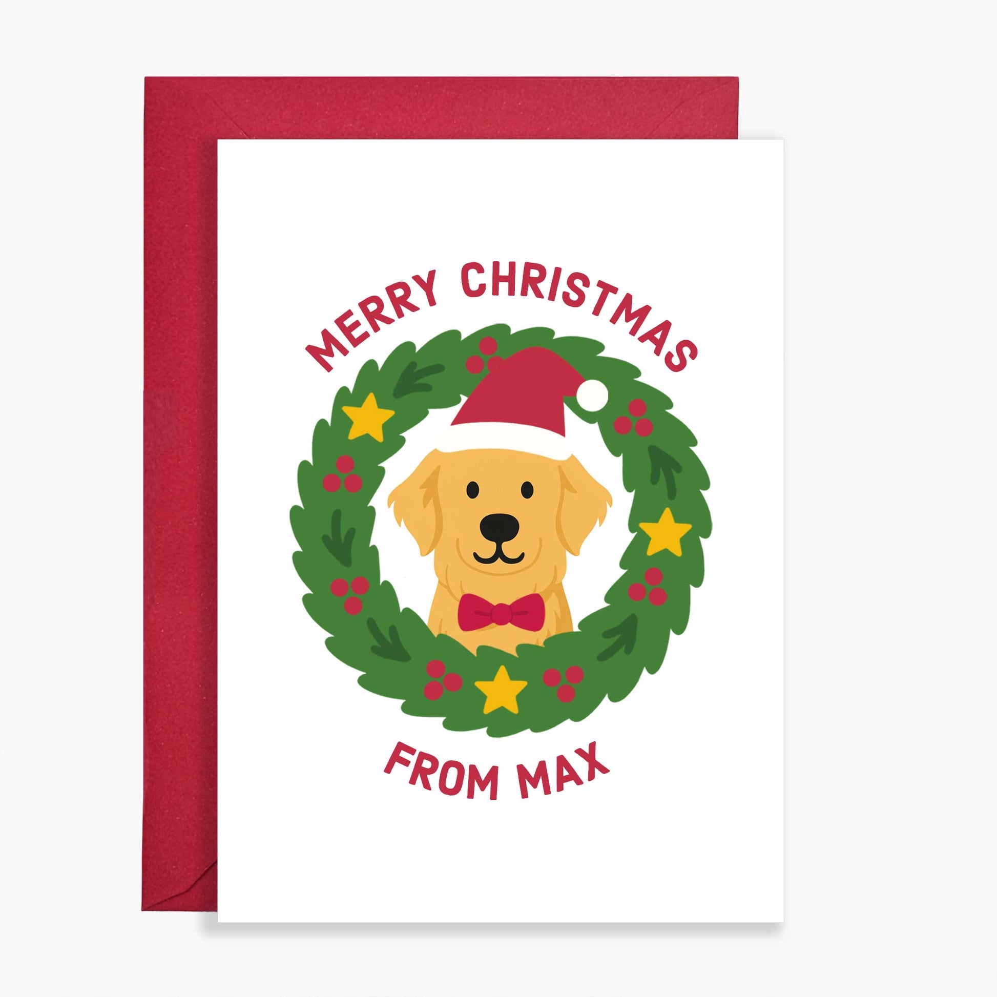 This adorable Merry Christmas from [Dog Name] card features a cute, minimalist golden retriever illustration framed in a festive wreath, complete with Santa hat and bow tie. A fun and personal way to send Christmas cheer from your dog!