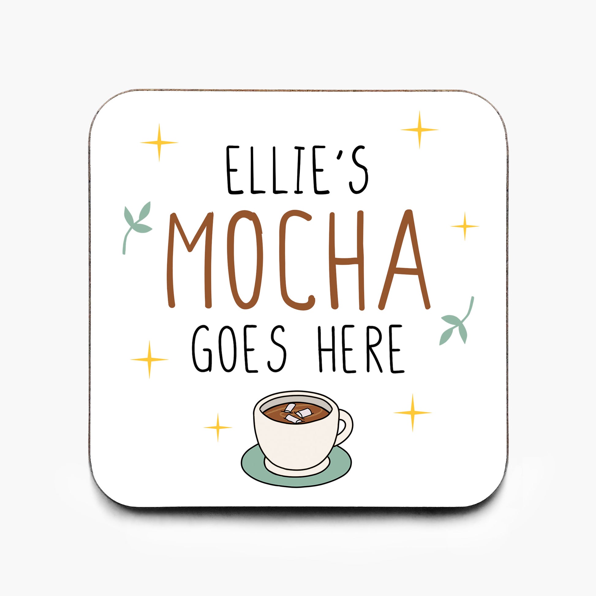 The printed text on the coaster reads: [name]'s mocha goes here.
