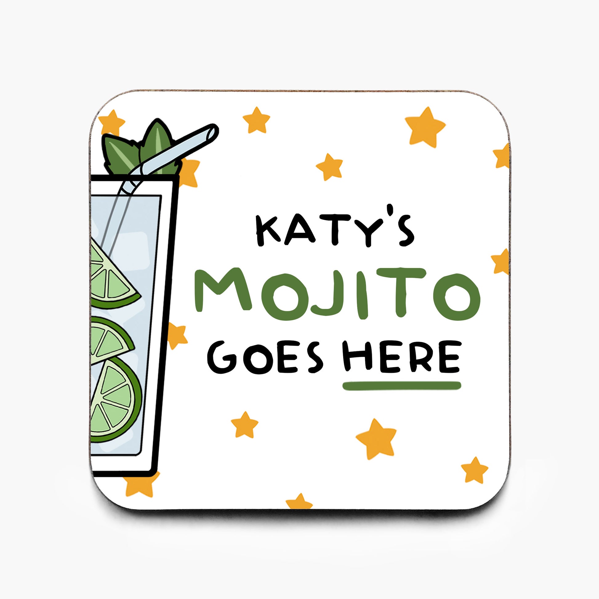 The printed text on the coaster reads: [name]'s mojito goes here.