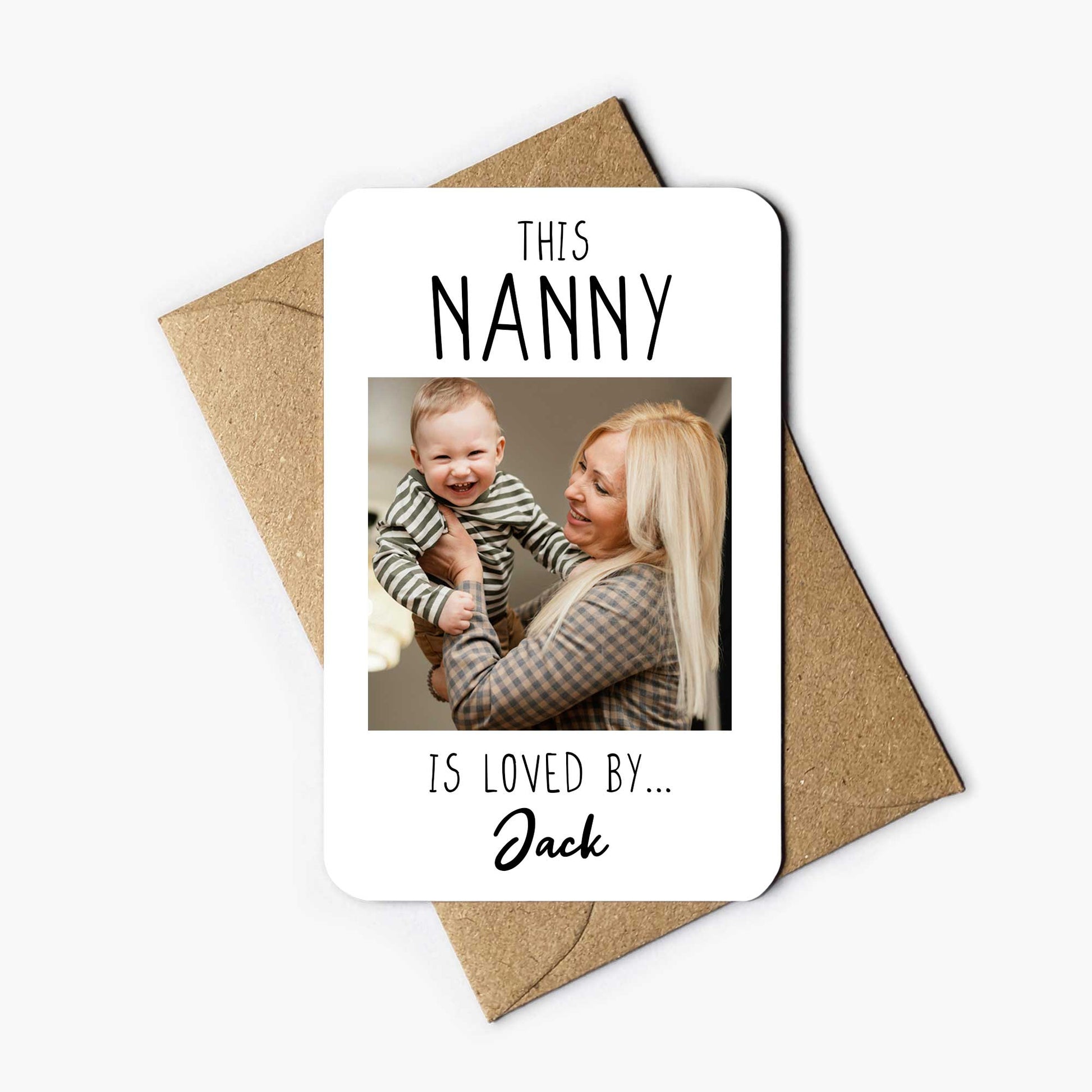 The printed text on the card reads 'this nanny is loved by...' followed by your custom [name or names].