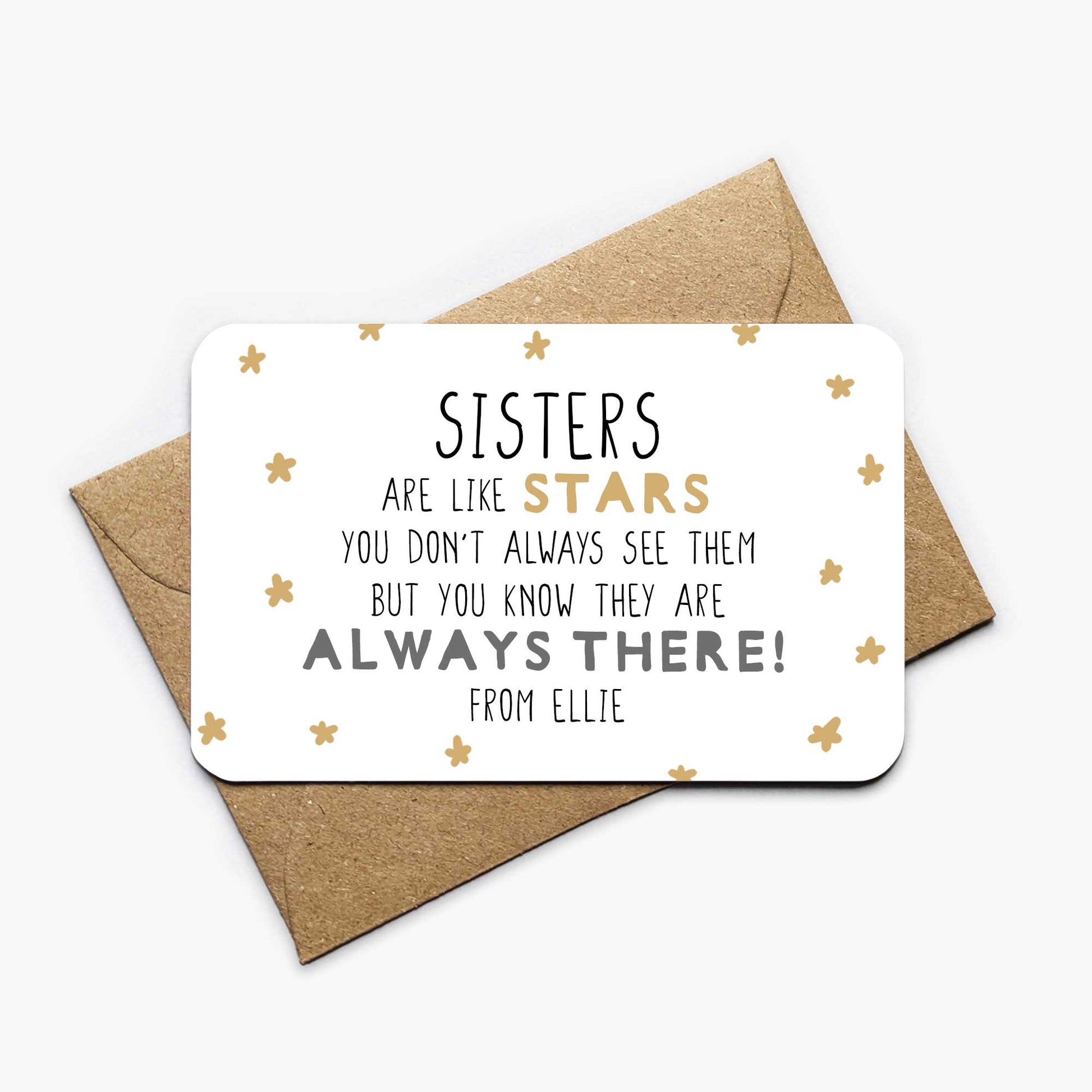 The printed text on the card reads 'sisters are like stars you don't always see them but you know they are always there' from your custom [name].