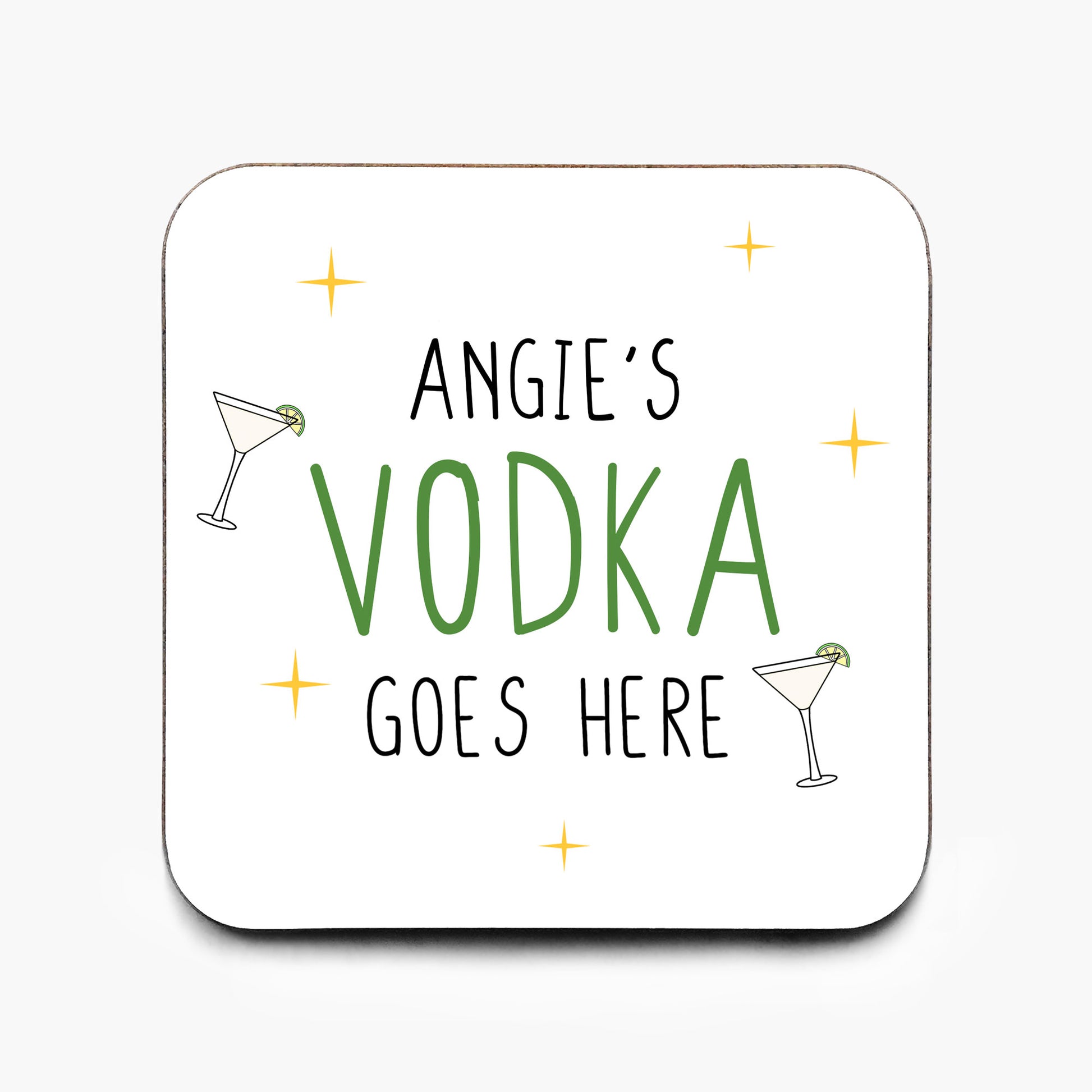 The printed text on the coaster reads: [name]'s vodka goes here.