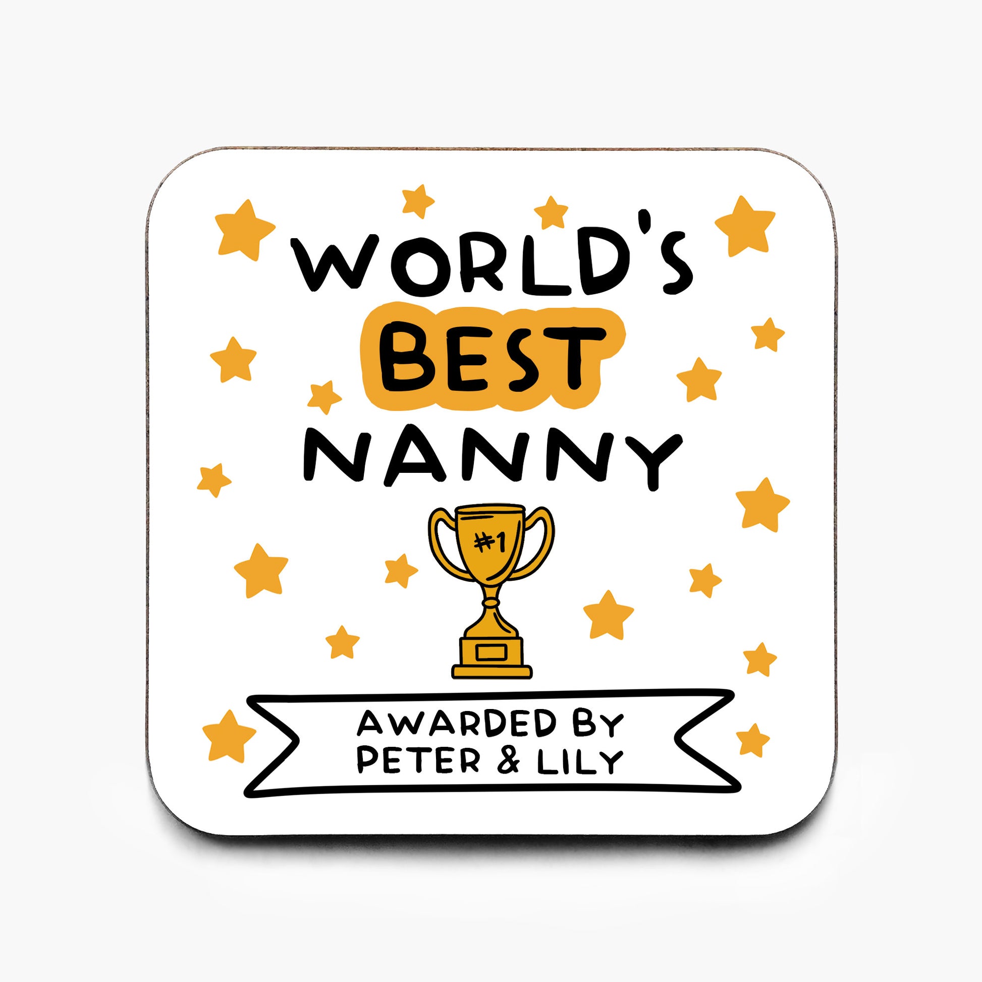 The printed text on the coaster reads: world's best nanny awarded by [name or names]