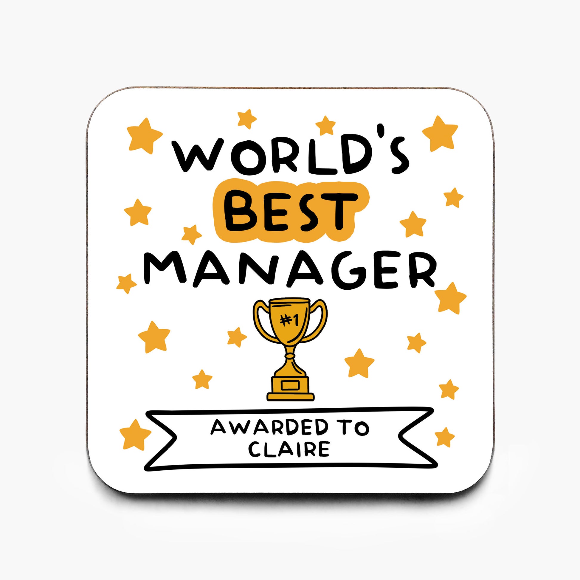 The printed text on the coaster reads: world's best manager awarded to [name]