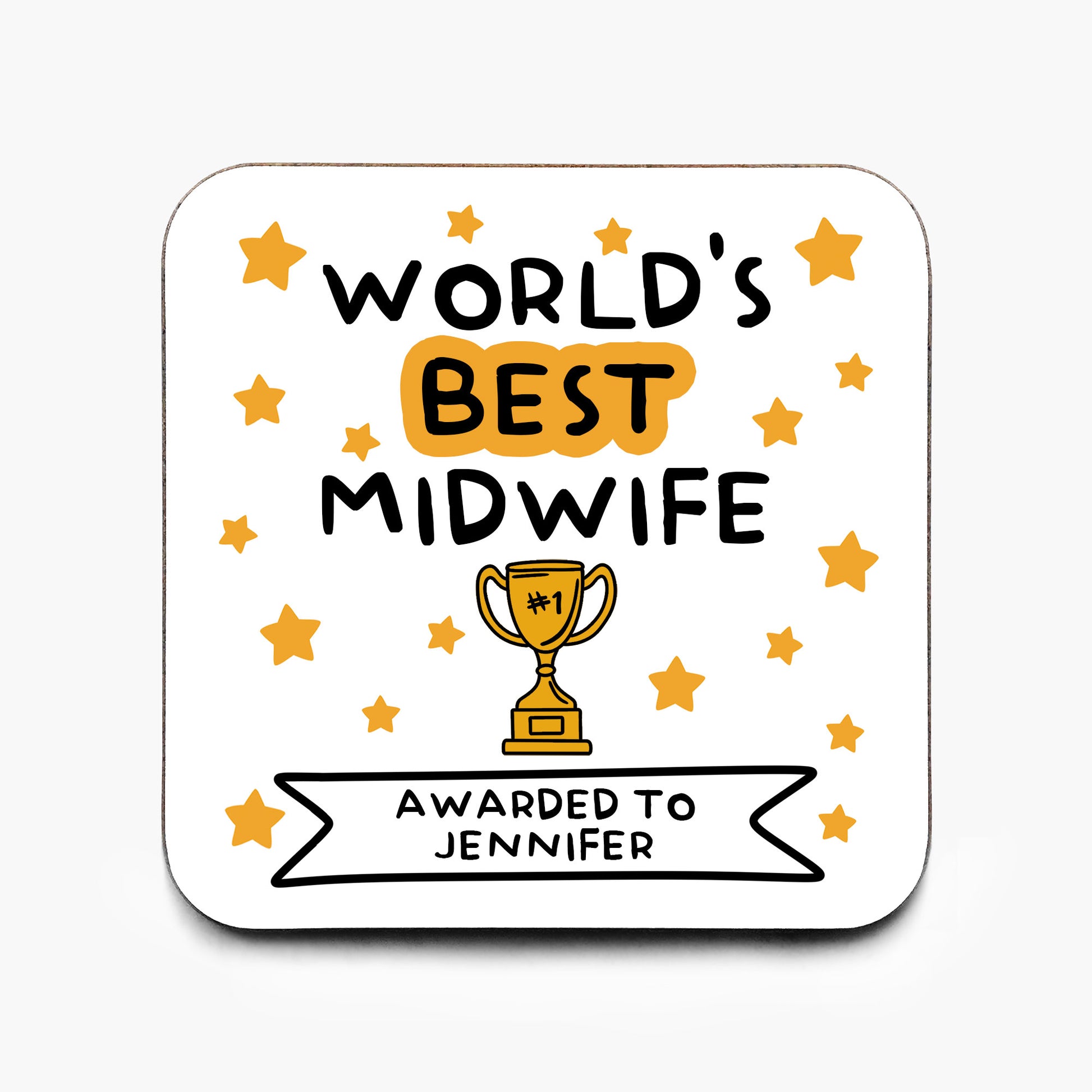 The printed text on the coaster reads: world's best midwife awarded to [name]